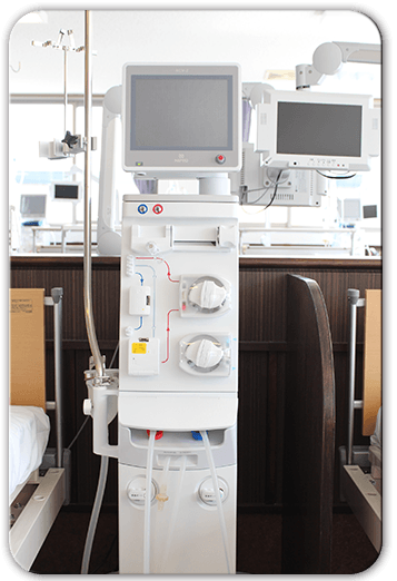 当院の透析治療は全台最新型のオンラインHDFです。 最もきれいな透析液である高純度(ウルトラピュア)の透析液を 使用しています。 厳重に水質管理された透析液で合併症の改善、予防をします。